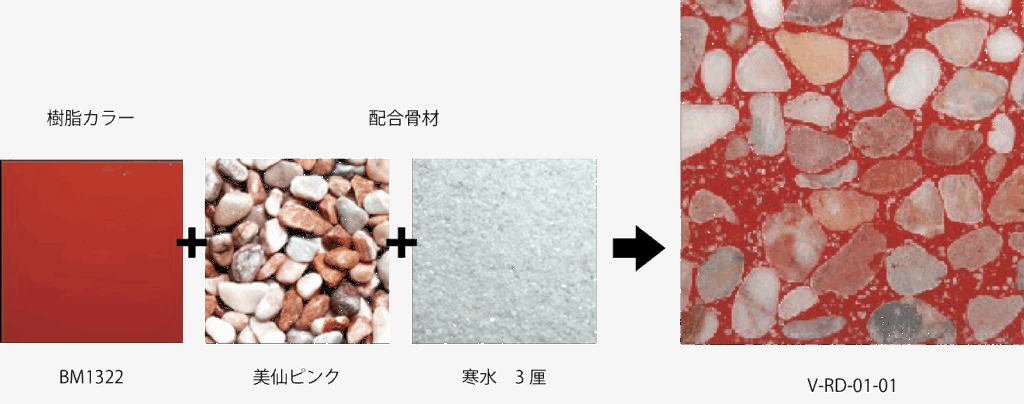 標準12色の他、自由なカラーバリエーションのエポキシ樹脂と表情豊かな天然骨材の配合で、仕上がりイメージは無限にひろがります。