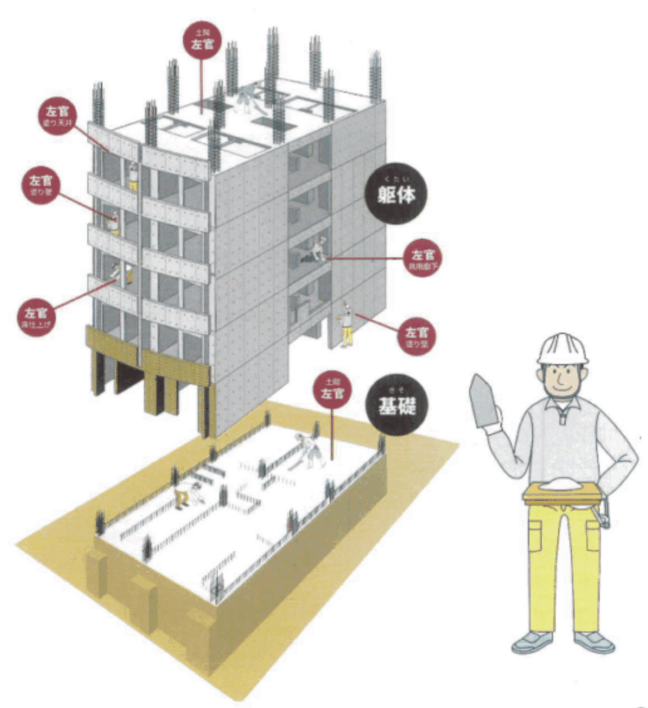 左官は躯体(くたい)の壁や床、天井などを鏝(こて)で仕上げる仕事です。左官の仕事でもっとも認知度の高い仕事は「塗り壁」ですが、ビル等の構造物では壁や天井、コンクリート床上げ下地、タイル・塗装・クロス貼り下地等多様な仕事があります。どの仕事も高い技術や経験、センス等が必要とされ建物の仕上げ精度を決める上で最も重要な部分を担うスペシャリストです。